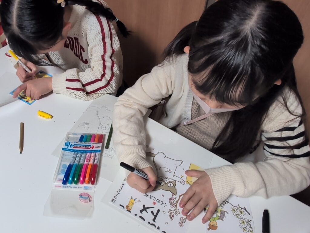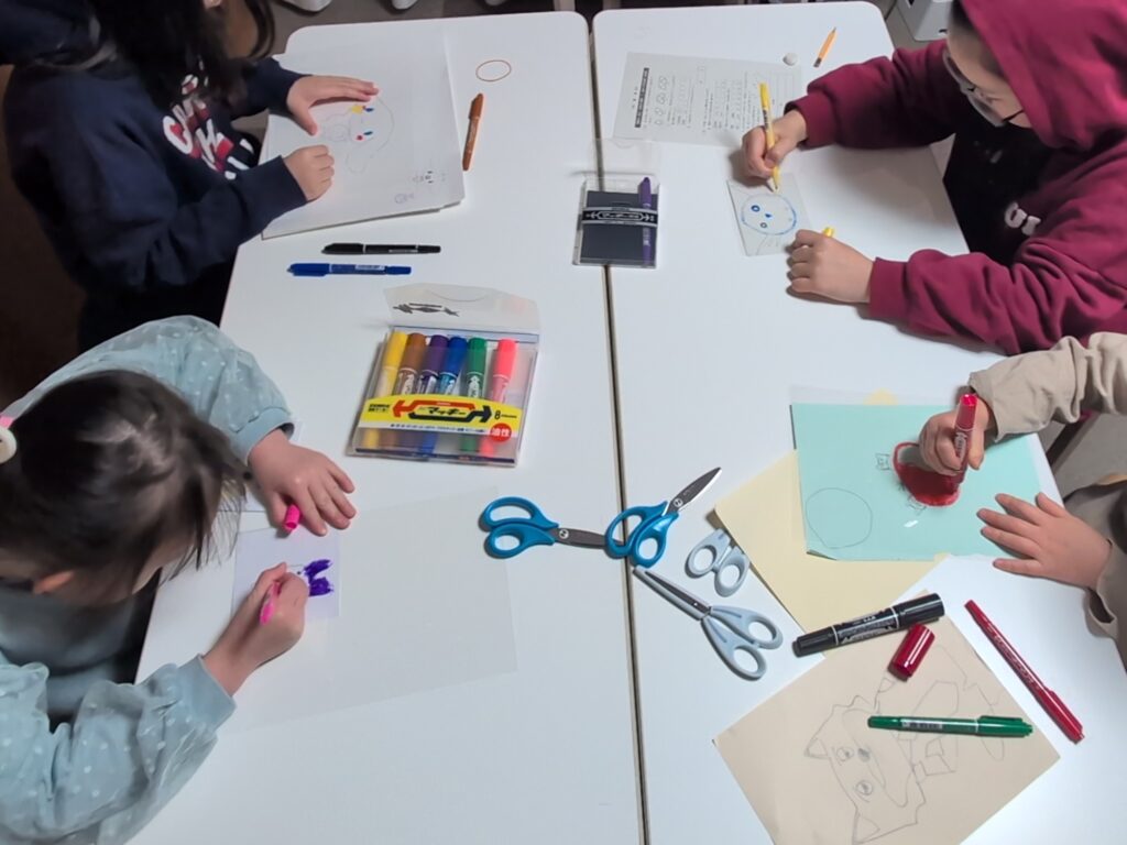 「絵を描く」「色を塗る」「台紙に貼る」「切る」「コーディングしてぷっくり仕上げる」—— ポスターにも書いたこの流れを、子どもたちは本当に丁寧に、そして楽しそうに取り組んでくれました。